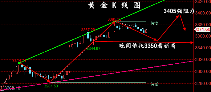 上周五的大非农对黄金影响依然还在,昨天周一仍然延续了周五的上升态势。早间最低回调到了3345反弹,日内虽然在3360附近横盘整理,但是晚间继续向上爬升,最高是给到了3385,并且凌晨的回落幅度不大,日线三连阳。 日线级别一定要注意三连阳或三连阴的形态,以后就容易出现反向单阴或单阳修正,那么这一次也不例外。 昨天虽然延续上升,但是在美盘前才发力上涨,晚间没有继续走高,最高只到了3385,并且小时线没有走连阳,只是单阳,所以力度要弱很多,短线上涨显颓势。 并且,从周五低点3281到3385,涨幅有104美金,基本没有像样的回调,调整肯定是有的,所以今日黄金看多不追多,谨防有回落调整,日线转阴的概