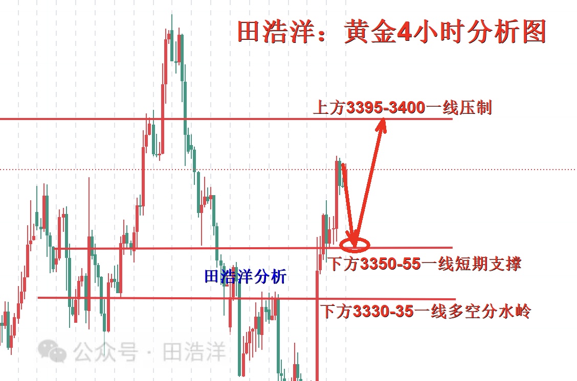 黄金周二完美按照我们分析策略进行,早盘我们给了3380-85一线做空的策略,在3360-65一线通知获利离场,晚间我们给了3350-55区间内做多的实时策略,完美在3365一线获利出局,相信关注我的朋友都可以看得到,午夜我们继续关注上方3395-3400一线关口压制,午夜如果此位置得不到突破,那么明天早上回踩调整还会进行冲击此关口的压制,如果顺利突破,下一目标看3430一线,总体趋势上我们保持回踩做多为主。如果你目前操作不理想,希望田浩洋能让你的投资少走弯路,欢迎前来沟通交流! 从4小时分析图来看,下方短期支撑关注3370一线,重点关注3350-55一线支撑,回踩依托此位置继续主多顺势看涨不
