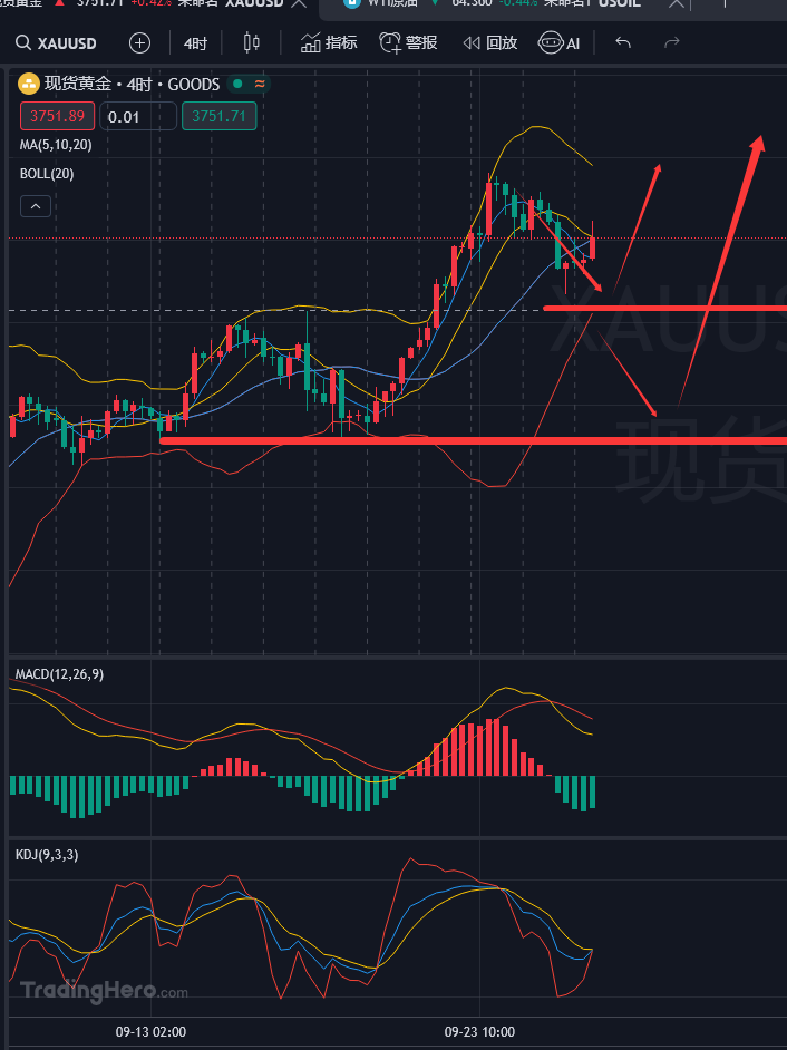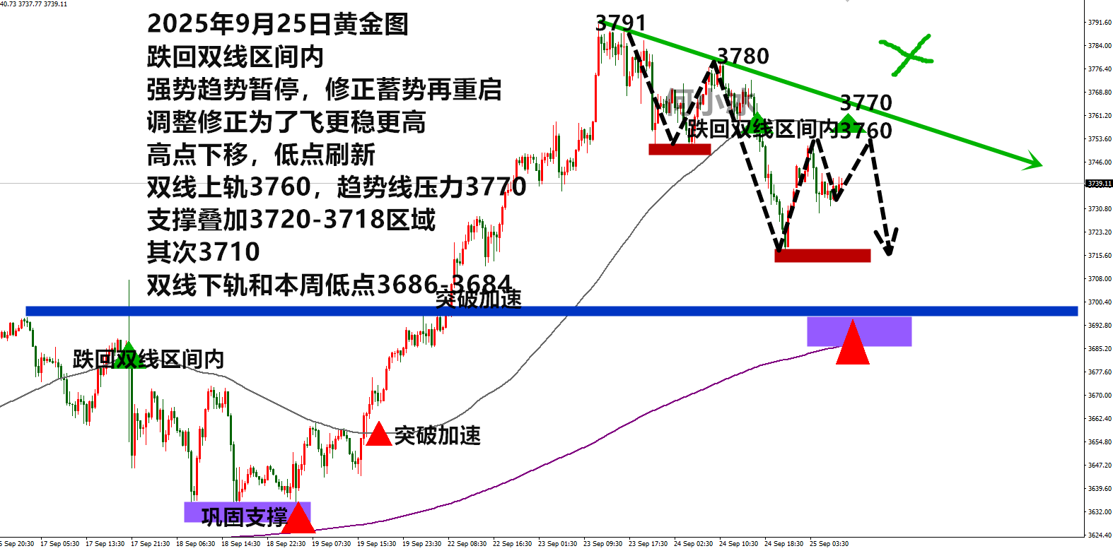 每日写博文分析也是希望能帮助到市场上迷茫的投资朋友,并不是图什么,只是想给在市场投资的朋友一个方向,操作的时候不至于那么迷茫,让久在市场亏损的朋友们找回赚钱的信心!对于实仓客户龚关铭提供一对一指导和看盘,进出场均有提示;不会因为忙碌而让你错失利润,也不会因为思路错误而让你资金受损。本金一直是我们的第一保障,盈利才是第二任务,盲目的操作带来的结果是你我都不愿看到的! ————————消息面 周四(9月25日)现货黄金缺乏明确的日内方向,在3750美元/盎司下方陷入涨跌互现的拉锯格局。市场普遍预期美联储将在年底前两次降息,这抑制了美元隔夜涨至两周高位的动能,并为无息资产黄金提供支撑。此外,持续升