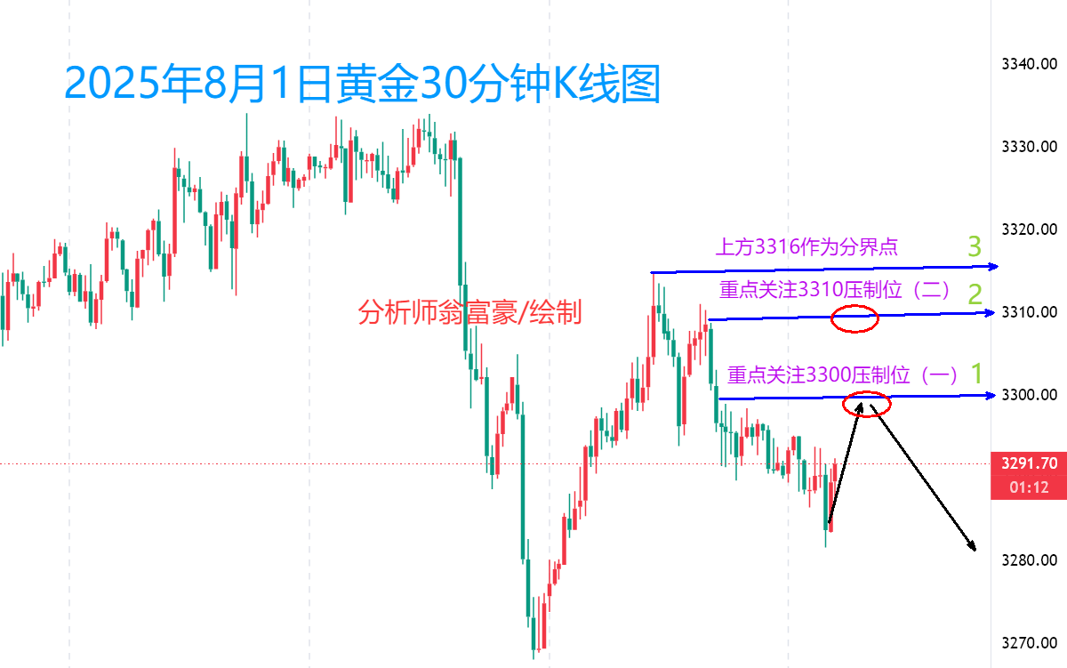 张津镭:黄金震荡格局待破,非农前择高进空,破位跟进 昨日黄金走了一个震荡偏空行情,亚盘开盘开始反弹,欧盘到达3310上方,给的空单在其下方进场,随后金价开始回落,不过后续跌幅不大,空单于3290附近小赚10多美金离场。最终金价是收盘于3289美元,日线收于一根小阳线。 周五(8月1日)昨日金价有所反弹,主要还是全球贸易不确定性加剧、美国通胀压力升温以及地缘政治局势紧张的多重因素共同作用。但目前依然美联储鹰派以及良好数据表现压制。今晚重点关注美国7月非农就业报告和美联储官员的讲话。 非农就业数据的表现将直接影响市场对美联储未来政策的预期。如果数据表现疲软,可能重新点燃降息预期,削弱美元并提振金