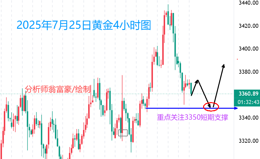 张津镭:贸易乐观情绪压制黄金,今日黄金以高空为主 昨日黄金走了一个回落行情,亚盘开盘小幅反弹但随后开始回落,午盘进场3386附近空单,欧盘继续下跌,美盘刷新日内低点至3350附近。不过后续开始反弹收回不少失地,空单于3355附近手动止盈离场,大赚30美金。最终金价是收盘于3367美元,日线收于2连阴。 周五(7月25日)市场对美国与日本、欧盟贸易协议的乐观预期削弱了黄金作为避险资产的吸引力,而美国劳动力市场数据的意外向好进一步推高美元和美债收益率,给金价带来显著下行压力。不过,特朗普总统对美联储的罕见访问以及市场对美联储利率政策的密切关注,为黄金市场增添了更多不确定性。 可以说,现在避险消退