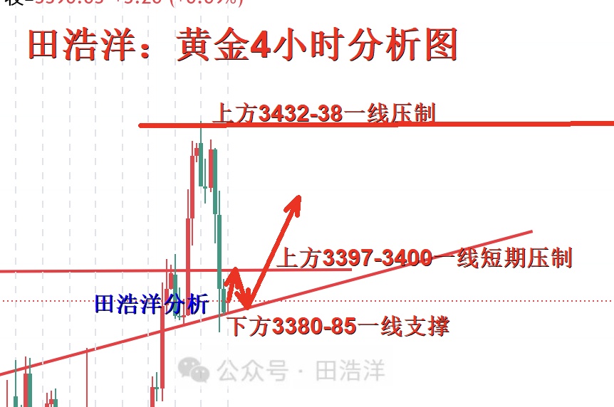黄金黄金昨晚触底3381一线后一直处于震荡上行,昨晚黄金大幅下跌,突破了3400一线关口压制,打破了多头短期强势的格局,虽然目前黄金大幅下跌,但是多头趋势依旧没有改变,毕竟下方关键支撑3380一线没有突破,黄金依旧存在强势崛起的可能,毕竟国际市场各方消息面都是有利黄金多头,再加上技术面黄金依旧有反弹的可能,所以黄金回踩我们继续以看多为主。如果你目前操作不理想,希望田浩洋能让你的投资少走弯路,欢迎前来沟通交流! 从4小时分析来看,下方支撑关注3380-85一线附近,日内回踩依托此位置继续主多顺势看涨不变,短期多头强势分界线关注3380关口,日线级别企稳此位置上方继续保持回踩低多节奏,逆势做空需