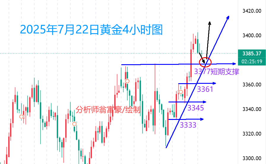 张津镭:多头强势但暗藏风险!黄金大涨后谨防回调! 昨天黄金走了一个大涨行情,早间开盘小幅上扬,随后午盘下幅幅度不大,于3350附近提前进场多单,随后金价开始反弹,美盘前后更是直接暴涨,连续突破阻力,最高是到了3400上方,多单亦是于3380上方手动离场,大赚30-40美金。最终金价是收盘于3396美元,日线收于一根大阳线。 周二(7月22日)随着8月1日美国对全球贸易伙伴施加新关税的最后期限临近,市场的不确定性为黄金提供了强劲的支撑。投资者们正密切关注欧美贸易谈判的进展、欧盟可能采取的激烈反制措施,以及美联储货币政策的潜在变化。在这样的背景下,黄金作为避险资产的吸引力正在迅速升温。 亚盘金价