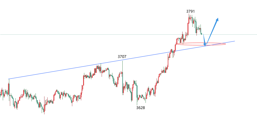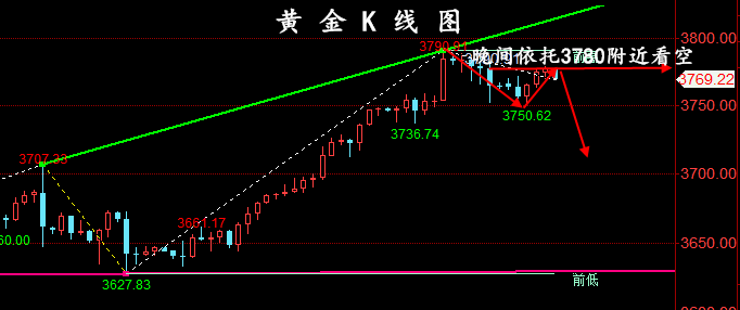 黄金又又创新高了,顶在哪里?这是很多人关心的问题,有人说了老师你不是说快见顶了吗?怎么还一直创新高?那么这一轮黄金多头是从3311开始的,到3791涨幅是达到了480美金,仅次于今天上半年四月份的那次上升幅度, 从幅度上来说已经很接近顶部位置了。 在经历多头初期酝酿阶段,中期强势上升以后,目前已经是这一轮多头的尾声,正在加速冲顶。这三个阶段的结构其实很明显,从日线图上来看的话,现在的加速冲顶是发生在美储利率决议以后,3700小幅调整回踩了一下短期均线,接着上来的。 那么现在日线已经走了三连阳,今天明天两天出现转阴调整的概率很大,有两种情况,第一是直接回落下跌,日线转阴。第二是冲高回落下跌,日