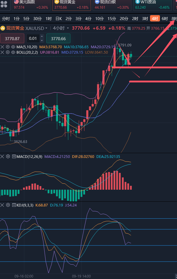 做投资,看文章,不仅仅是看行情分析和操作建议,行情是瞬息万变的,大部分文章从分析到写完发出来是具滞后性和时效性的,具体操作还是要以实盘实时点位为主,而且投资资金量不一样,做单的手法也会有不同。因此看文章重点要做的是学习,要了解为什么此时行情要这样分析,操作思路要如此确定。以便结合自己在实际操作中借鉴融合从而形成自己的操作方法,从而不再依赖别人,自己会操盘! ————————消息面 周三(9月24日)现货黄金高位震荡,目前交投于3769美元/盎司附近,距离隔夜创下的历史新高不远。现货黄金周二再度创下纪录新高至3790.97美元/盎司,最终收于3763.93美元,涨幅达0.46%。一方面,美联储