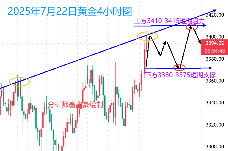 基本面关注两方面:7月加息落地后,市场焦点将转向9月降息预期及地缘政治风险演变。上行风险方面,若美联储释放鸽派信号或中东冲突升级,金价可能突破3400关键阻力;下行风险方面,若通胀数据超预期或地缘风险缓和,金价或下探3350支撑位。周一黄金开盘后先回落至3345支撑位反弹,近期行情呈现剧烈震荡特征。昨日分析已指出当前市场受消息面影响显著,当价格涨跌幅出现停滞时,翁富豪建议大家暂缓追涨杀跌操作,保持观望态度。早盘价格回落后短线快速拉升,此时不宜盲目追涨。翁富豪认为需重点关注上方3400关键阻力位,该位置未被有效突破前,上涨持续性存疑。若黄金价格强势站稳3400上方,预计将延续上行趋势。 操作策