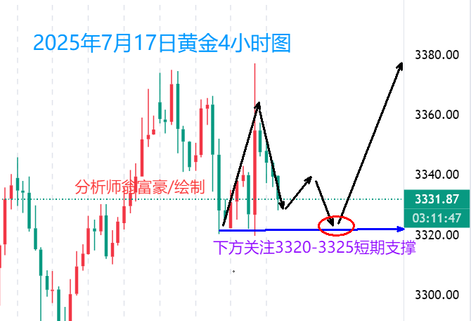 现货黄金: 消息面:周三(7月16日)黄金市场经历了一场戏剧性波动。纽市早盘因美元走强,金价一度跌至3319.58美元/盎司的日内低点,但随后彭博一则“特朗普考虑解雇美联储主席鲍威尔”的报道瞬间点燃市场避险情绪,金价狂飙逾50美元,触及3377.17美元的三周高点。然而,剧情再度反转——特朗普迅速否认解雇计划,金价涨幅收窄至0.68%,最终收报3347.38美元。 技术面:从4小时图来看,布林通道平行收窄,价格运行区间受限。昨日金价自下轨附近反弹,一度触及上轨3377位置后承压回落,最终收盘于中轨附近,且上影线较长,显示出上方压力明显。黄金目前正在一个狭窄区间内盘整,价格徘徊在20日SMA3