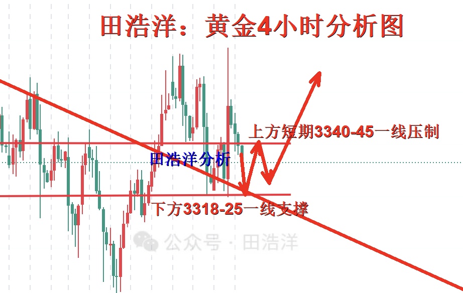 黄金昨天晚上半夜特朗普和鲍威尔事件让黄金强势拉升到了3377附近,黄金冲高只是昙花一现,最终黄金日线收阳,但是收了一个超级长的上影线,最终金价快速上行冲高刺破3377关口承压回落陷入震荡收盘,日k线报收冲高回落震荡中阳,整体金价虽然在消息面刺激下反复震荡洗盘拉锯,但终究未能突破近期大的箱体震荡区间,今天我们继续关注下方支撑3318-25一线,回踩我们继续做多!如果你目前黄金操作不理想,希望田浩洋能让你的投资少走弯路,欢迎前来沟通交流! 从4小时分析来看,今日下方短线支撑继续关注3318-25附近,上方短期压制关注3340-45一线,上方重点压力关注3380一线,整体依托此区间依旧保持高空低多