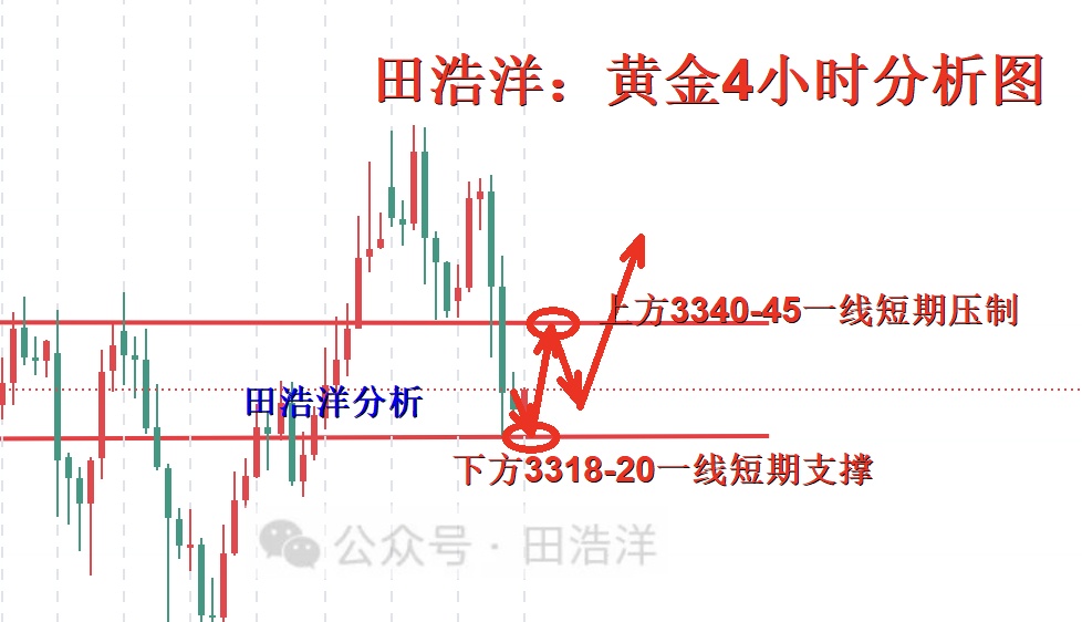 黄金昨日跌破3341一线后反弹最高点在3350-52附近震荡回踩,今天我们在3320-25一线做多,目标3340-45一线已经到达,晚间我们继续关注3340-45一线短期压制,但是整体反弹力度有限。3340-45这个点位在上周五曾多次做空出现回落,目前再次下行破位,因此我们目前空单可以提前到3340-45去参与,黄金今天开盘3322一线反弹,技术面回踩3318-25一线需要进行反弹修复,所以我们下方可以找机会做多进行把握反弹的利润空间,如果你目前黄金操作不理想,希望田浩洋能让你的投资少走弯路,欢迎前来沟通交流! 从4小时分析来看,上方短期压力关注3340-45附近,下方关注3318-25一线