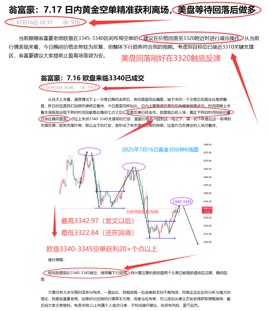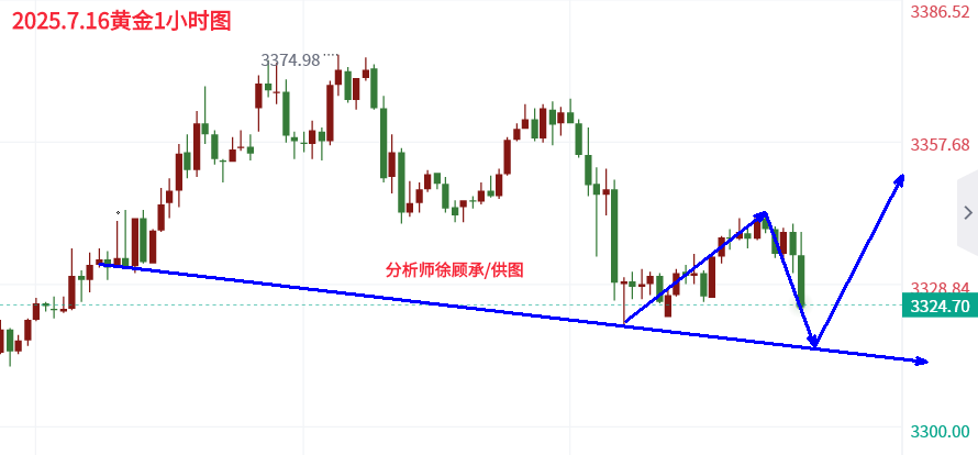 如盈财女:7.16黄金原油如期下跌,午夜最新行情分析策略 在昨天美国CPI数据落地之后今天公布的美国PPI生产月率大幅下降,跟昨天的通胀数据虽然有所相悖,但是也恰好遥相呼应,美元指数稍微回踩之后再度走强,依旧是强化了美联储九月份降息本月维持利率不变的预期。 黄金日内先震荡回弹,高点测压至3343一线,目前行情再付回撤到3335-30区域震荡。从日内黄金运行节奏来看,虽然日内回弹的幅度略超预期,但是并未能完全改变已经形成的弱势趋势,晚间行情还是有望继续调整回修的。从3322附近企稳震荡反弹到3342附近承压, 黄金日内3342这个位置也是我们早间跟大家分享的空单进场位置,目前如期回落到了332