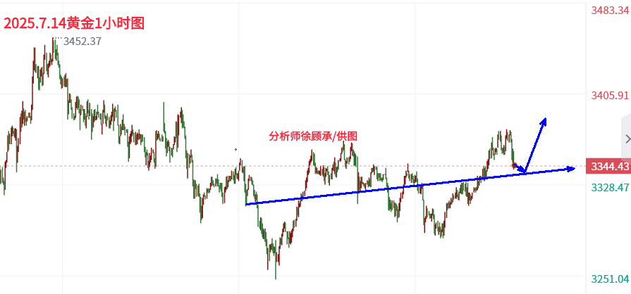 截止至2025年07月14日亚盘时段,上周的国际黄金价格其实还是以震荡节奏为主,虽然前段时间受到关税加征的影响而再次冲击3350一线,不过随着欧盟和中国的贸易谈判进展顺利,市场对更宽松的贸易政策抱有期待。黄金作为传统的避险资产,其价格通常在全球经济不确定性加剧时上涨,然而近期美国与主要贸易伙伴之间的谈判释放出乐观信号,削弱了市场对避险资产的需求,不过美联储目前的政策动态仍存在极大的不确定性。 黄金价格陷入高位震荡 国际金价小幅收涨,盘中一度触及3330美元关口,但最终涨幅受限。这一走势完美体现了当前黄金市场的矛盾格局:避险情绪与美元反弹的角力。 一方面,特朗普突然宣布对巴西进口铜