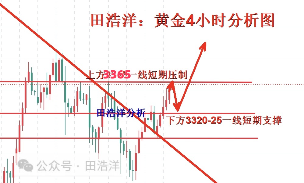 转眼本周交易也临近结束,今天我们在3340附近空单,小幅获利在3332一线获利出局,今天周五行情以震荡回踩上行为主,这种窄幅震荡有几个点需要注意,一个是不能贪太多利润,如果一直想等单边本周会错失一些利润;另外一个就是进场点位要把握住,如果中间点位进场可能守一天都难出局;昨日我们给了25-30一线多次做空,但是触及次数越多破位风险越大,所以操作上一定要带防守。目前黄金处于3360一线附近震荡,慢涨型的行情我们只能先观望为主,等待行情明朗再进场。如果你目前黄金操作不理想,希望田浩洋能让你的投资少走弯路,欢迎前来沟通交流! 从4小时分析来看,午夜下方支撑关注3320-25附近,短期多头强势分界线3