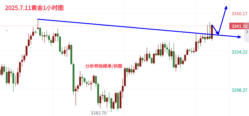 如盈财女:7.11黄金周尾谨防冲高回落,注意市场节奏 黄金昨日先居高震荡,晚间行情有所回修,低点回撤至3310附近,然后半夜行情再度回弹,收回到3320上方,日线再收得一小阳星线。周四受美元指数走强以及特朗普第二波加税信函的影响下,黄金在震荡中收高,小幅上涨。 日线结构上,黄金昨日有回弹延续可以理解,收在5、10日线附近在技术上也是合理范围内的,但是连续两日收小阳,已经对市场情绪构成很大的影响,这或有可能会改变技术走势预期,着重看今日对上方20日线3340测试情况如何。倘若今日行情站上3340之上,那么日线结构将有可能发生质变风险,之所以将上涨视为风险,是因为目前技术上并不支持上涨,基本面也