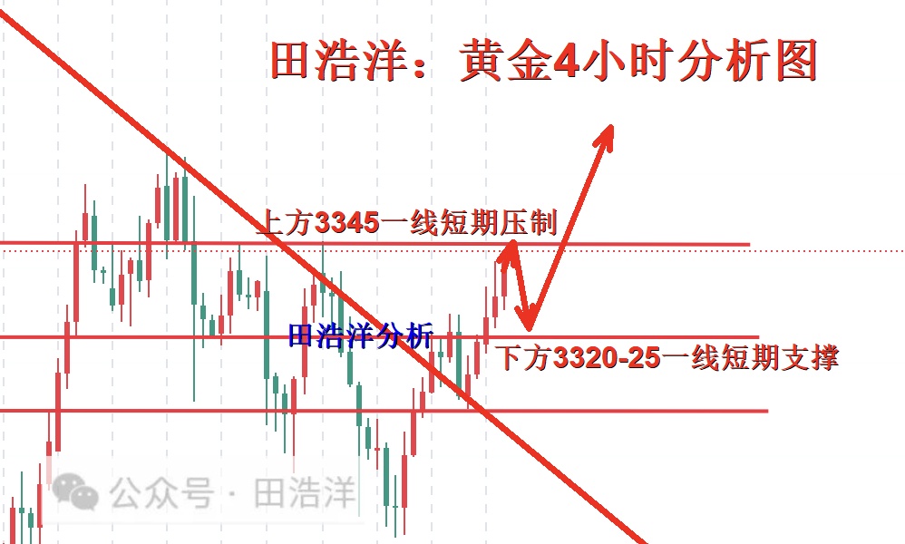 昨日黄金技术面依托3310关口延续多头强势震荡上行破高收盘,晚间美盘加速冲高刺破3330关口回落陷入震荡反复,昨日我们多次在3325-30一线做空,在3310-13一线组多,全部获利出局,最终凌晨金价二次回踩下探并企稳3310关口反抽震荡收盘,日k线报收震荡中阳,整体金价延续多头强势震荡上行节奏,周五我们获利出局落袋为安为主,如果你目前黄金操作不理想,希望田浩洋能让你的投资少走弯路,欢迎前来沟通交流! 从4小时分析来看,今日下方支撑关注3309-16附近,短期多头强势分界线3295-3301附近,整体继续保持高空低多顺势看涨节奏不变,日线级别未跌破3300关口之前任何回踩均是做多机会,逆势空