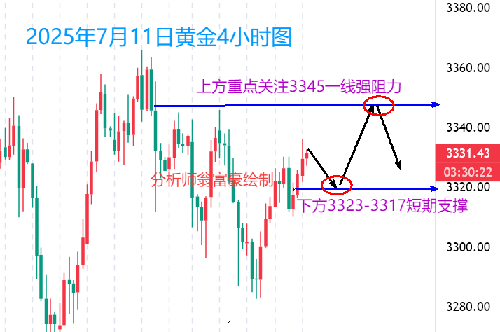 当前黄金市场受多重因素角力影响。特朗普关税政策带来避险支撑,但美元走强与美债收益率上升压制金价涨幅。美国劳动力市场释放矛盾信号,叠加美联储对降息持谨慎态度,使得金价走势更显扑朔迷离。短期来看,金价或继续维持区间震荡格局,若无地缘政治或贸易摩擦的重大恶化,突破3400关口存在较大难度。翁富豪建议大家重点关注7月15日将公布的CPI数据及美联储政策动向,这些关键信息将为金价后续走势提供重要指引。 小时图显示,布林带收口呈收缩震荡,价格站稳中轨后向中上轨反弹。昨日两次下探3310后企稳回升,1小时均线拐头向上。若早盘回踩3320上方企稳,可顺势做多,当前1小时级别已打破下行趋势,价格突破3330后
