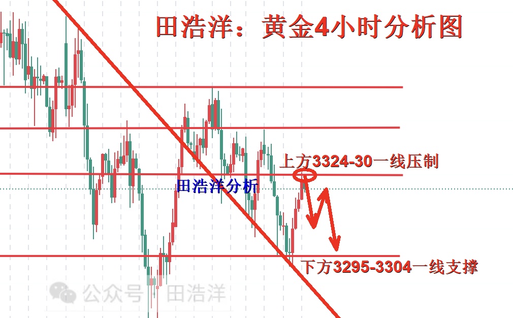 昨日黄金技术面先抑后扬企稳3280关口再度迎来多头强势震荡上行深v反弹破高,我们在3285-90一线不断让大家做多,同时也告知大家低位不要追空,晚间美盘接连拉升突破并站上3320关口再度迎来多头反弹,短线多空来回震荡拉锯,今天我们早上在3325一线做空,目前3317一线已经获利出局,上方我们继续关注3324-28一线压制,反弹不破我们找机会入场做空,如果你目前黄金操作不理想,希望田浩洋能让你的投资少走弯路,欢迎前来沟通交流! 从4小时分析来看,今日短线依托3300关口先行做多再看延续反弹回升,上方短线压力关注3324-30一线区域,日内先行依托3300-3330区域保持多空宽幅震荡运行节奏,