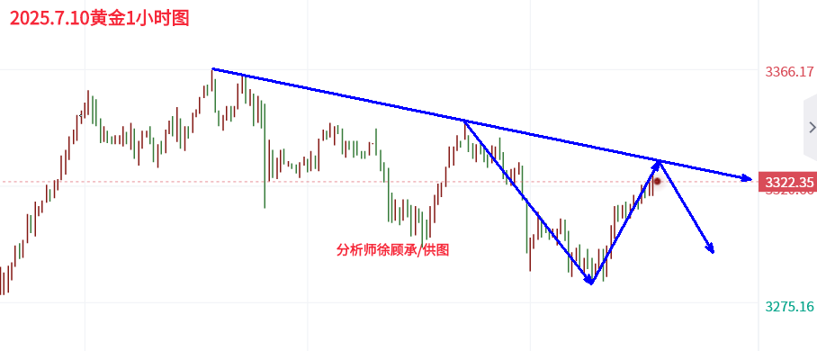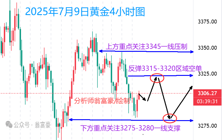 周三(7月9日)现货黄金延续震荡下行走势。受美国与贸易伙伴达成协议乐观预期影响,避险资金流出,叠加美元走强及美债收益率上升,金价周二大跌超1%。重点关注晚间美联储会议纪要公布。当前金价处于弱势下行通道。关键阻力位3345美元多次未能突破,形成重要压力位;3300关口多次被刺破且低点不断下移,日内已跌至3280附近出现反弹迹象,下跌趋势或将延续。今晚需重点关注3275-3280区间支撑力度。美联储利率决议将于午夜凌晨公布,需警惕市场可能出现反弹行情,翁富豪建议大家提前做好应对准备。 从小时图来看,昨天黄金从3345高点下跌到3320后,在3320-3330区间整理了一段时间。美盘时段价格跌破3