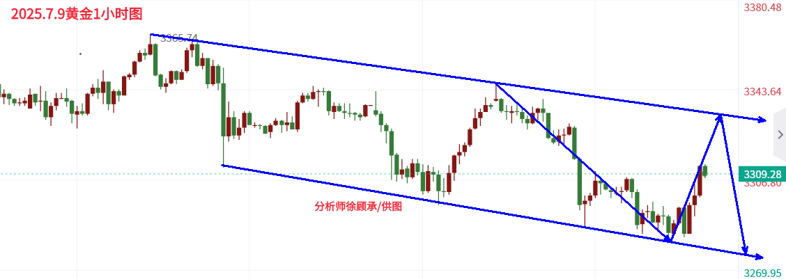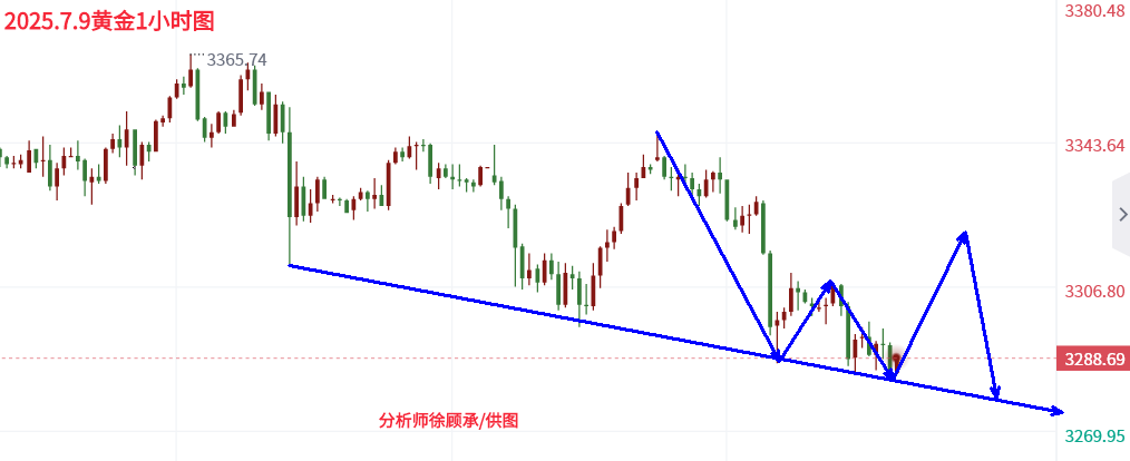 7月9日欧洲时段,黄金价格延续既有基调,最低触及3282美元关口,触及本周三以来一周低点。美国高额关税预期或推高通胀,使美联储长期维持利率稳定,支撑美债收益率攀升,助力美元在两周低点附近企稳,成为抑制无息黄金的关键因素。全球风险情绪因贸易关税担忧而脆弱,市场聚焦FOMC会议纪要,以探寻美元及贵金属未来走向的关键线索。 黄金昨日早盘冲高后便开启震荡洗盘模式。至晚间价格突破预期区间,跌破3297关键支撑后,继续下探至3287一线。这一走势直接破坏了4小时头肩底形态中右肩的上涨结构,日线最终收阴,暗示短期行情有转弱迹象。目前黄金已逐步脱离前期震荡区间,K线受短周期均线压制,偏弱态势明显。在日线级别