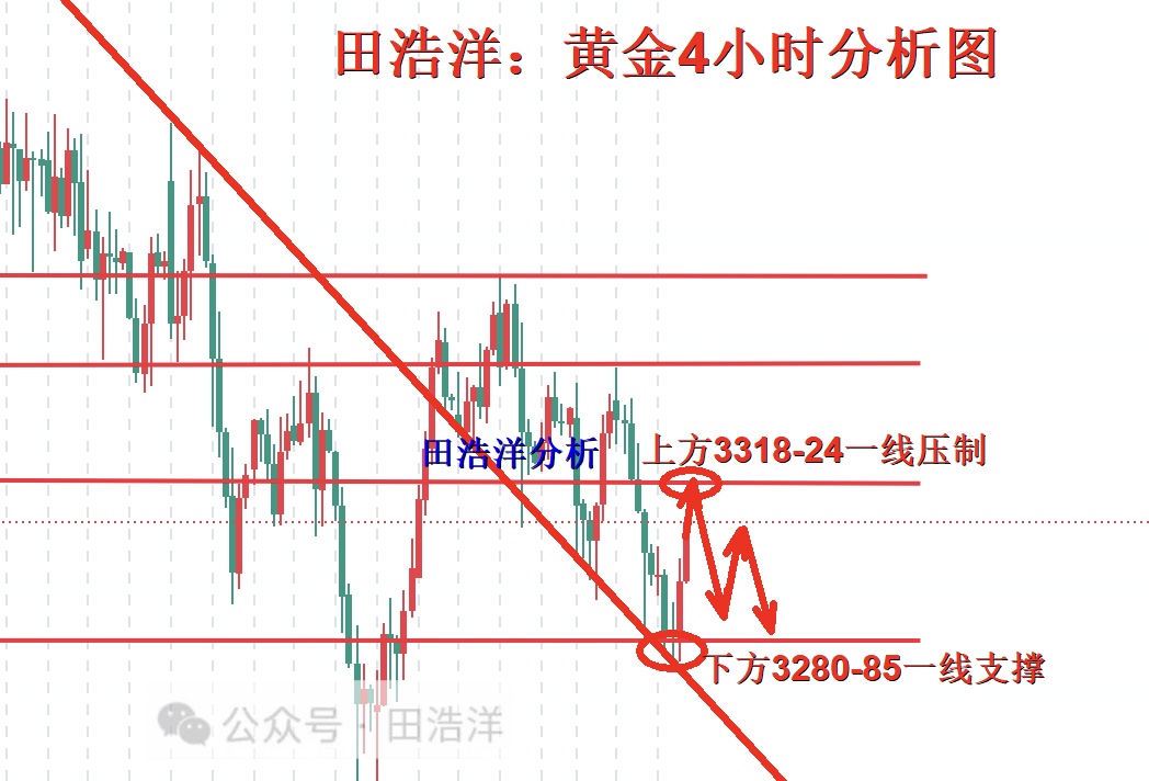 黄金今天多次提醒大家低位不要追空,现在大家看到了吧,黄金触底反弹,我们也在3285-90一线做多,多单也是完美获利中,相信关注我文章的朋友都可以看得到,本人一直强调不低位做空,回踩3285-90一线做多也是大家有目共睹,午夜我们继续关注上方3318-24一线压制,反弹不破我们再找机会做空,希望大家都能够把握住进场位置,拿住利润。午夜反弹先看3324一线前期跌破点,反弹受压再空!如果你目前黄金操作不理想,希望田浩洋能让你的投资少走弯路,欢迎前来沟通交流! 从4小时分析来看,今日上方短线阻力关注小时线顶底转换位3318-24附近,日内反抽依托此位置先空一次下看回落,下方短线支撑关注3280附近,