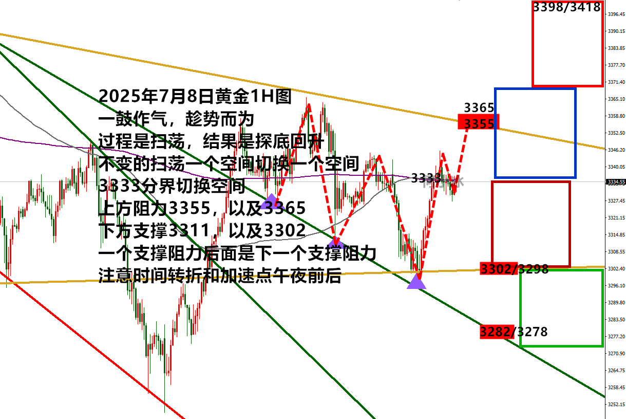 看不懂的走势,最好别动!涨和跌,都缺乏连贯性。追,大概率都是坑。确凿分析依据下制定的交易策略,你试试,脸都能被打成面瘫! 昨天就 V 了,一个 V 型走势直接把市场中绝大部分的短线交易者干蒙圈了。马后炮的分析,谁也能找一箩筐! 技术面,如上图所示,金价位于收口走平的布林中轨,布林这种态势,金价可上可下。 预计金价会在 3305 ~ 3360 这个区间进行钟摆! 看不懂,没把握,该闭嘴就得闭嘴!该苟着就得苟着! 薛晓庆分析观点写于 2025 年 7月8日 星期二下午 15点55分 助理号:gold5588