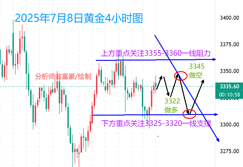 张津镭:关税延期难消隐忧,黄金震荡待破局! 昨日黄金走了一个探底回升行情,亚盘开盘开始回落,午盘波动到3315继续进场空单,随后欧盘最低是到了3296一线,不过后续开始企稳上行,空单于3300附近小赚10余美金离场。美盘收回不少失地,最终金价是收盘于3336美元,日线收于一根小阳十字。 周二(7月8日)美国****宣布8月1日起对日本、韩国等14国加征25%-40%关税,并威胁对金砖国家额外征税,引发市场对全球贸易战的担忧,推动避险资金流入黄金。不过关税暂缓期延长至8月1日,短期缓解了市场紧张情绪,但不确定性仍支撑金价。 不过金价仅反映"谈判乐观情境",若未来72小时内美日谈判破裂,全球供应