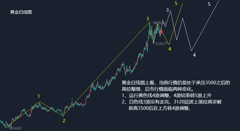 国际黄金在上周上涨近2%后出现回调,目前最低已跌至3205一线。尽管短期避险情绪减弱,但金价年内累计上涨超过25%,受益于央行强劲购金和ETF资金持续流入。黄金市场短期虽出现技术性回落,但在美国贸易政策不确定性未消、地缘局势复杂的背景下,黄金仍将维持避险资产主导地位。关注7月9日前后美方动向,一旦谈判破裂或关税如期实施,避险需求将迅速反映至金价上行。 现货黄金: 日线级别,结构上维持我们之前的观点不变,3500见顶回落我们主观看4浪调整,后市依旧有另一种变化,3500向下调整仍处于3浪延长浪,后市拉高后再开启4浪调整。如下图所示: 4小时级别中,如下图,3500向下联合型WXY三波调整,35