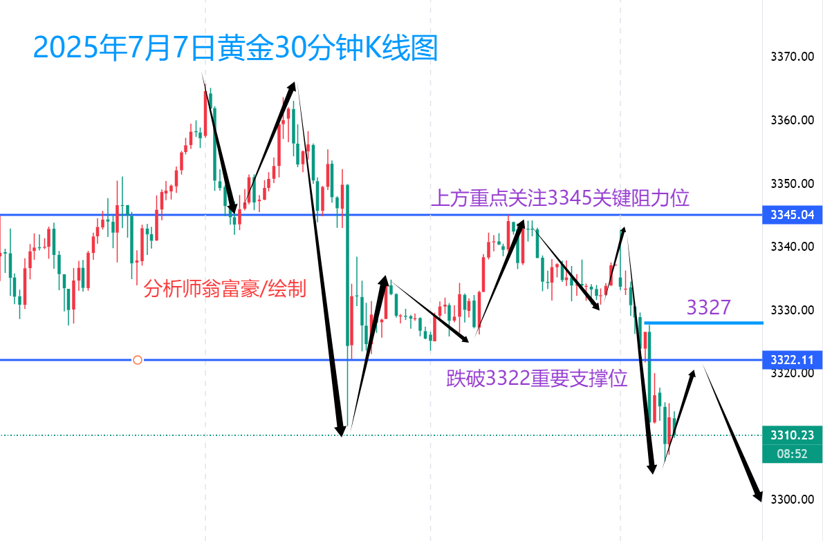 张津镭:特朗普关税倒计时,黄金空头能否延续? 上周因特朗普力推的“大而美法案”成功闯关众议院,美元指数有所回落,现货黄金震荡上行,盘中一度重回3340美元,但未能企稳在这一关口上方。本周首先继续关注中东问题以及特朗普****关税问题。其次就是看周四凌晨的美联储纪要了。 周一(7月7日)金价开盘小幅反弹后直接回落,目前接近3300关口一线,周评提到3340下方直接进场空单,目已然收获30余美金。现在就是看3300-3290一线支撑了,跌破黄金将会开启新一波下跌。反之,黄金将维持3300上下震荡。 不过后天7月9日关税豁免截止日临近成为市场焦点:关税政策变化:特朗普****计划向约12个国家发送
