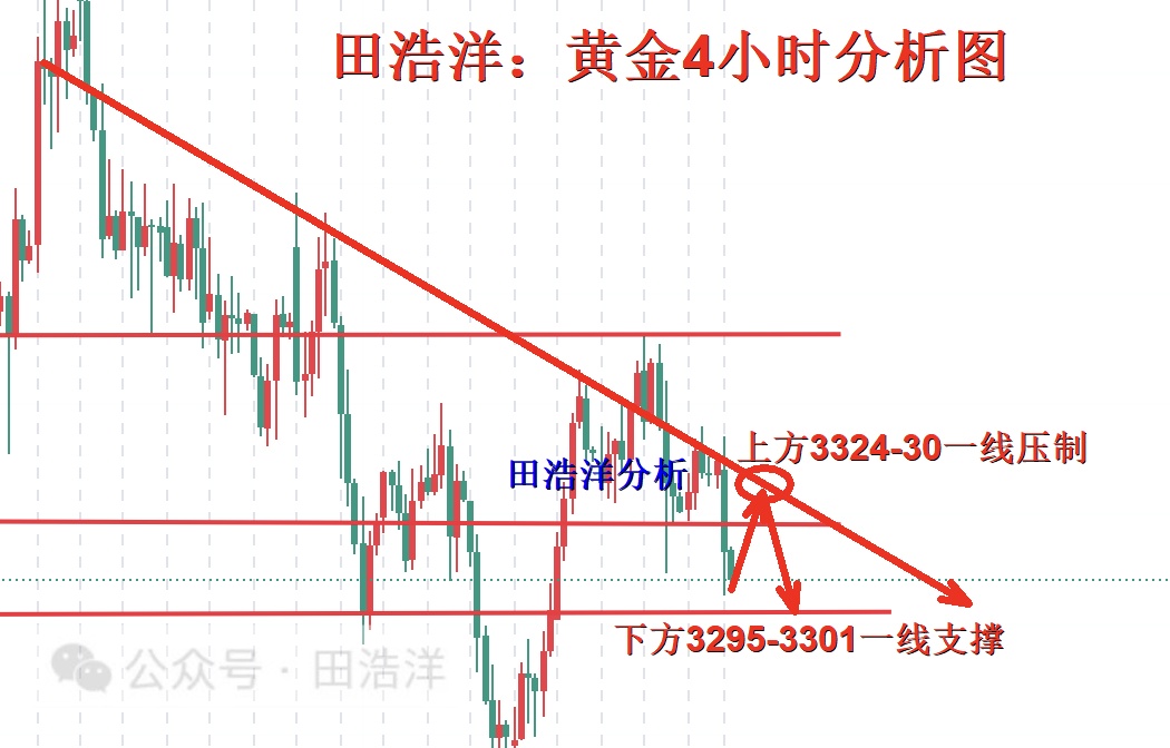 黄金今天周一开盘迎来回踩下行破底,最终向下加速击穿上周五非农低点3311关口,短期金价进一步延续弱势空头震荡下行节奏,今日上方阻力关注早间开跌口3324-30附近,日内反抽依托此位置继续主空顺势下看回落不变,短期空头弱势分界线关注3345关口,日线级别未突破并站上此位置之前任何反抽均是做空机会,黄金今天早间开盘空头二次消化目前回踩最低3306一线,操作上我们先关注3295-3301一线情况,如果今天突破下方支撑,那么行情反转空头了,否则我们继续保持触底反弹,找机会做多为主。如果你目前黄金操作不理想,希望田浩洋能让你的投资少走弯路,欢迎前来沟通交流! 从4小时分析来看,下方关注3295-330