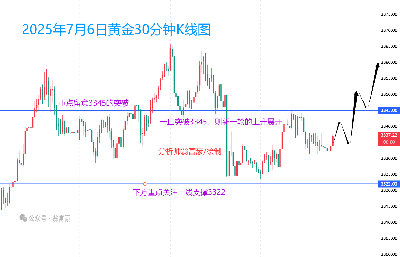 张津镭:非农余波未平!黄金下周如何布局? 周四非农走了一个回落行情,强劲的就业数据不仅推高了美元和美债收益率,还显著削弱了市场对美联储提前降息的预期,令黄金的吸引力大幅下降。不过昨日因提前休市黄金波动不大,最终金价是收盘于3334美元,日线收于一根小阳线。 周末需要关注事件不少,首先是周日公布的美国6月非农后续修正值及市场情绪调整。若调整不大,那么自然还是偏向回落。其次就是美越贸易协议细节及特朗普对其他国家(如日本、印度)的关税政策动向,一旦继续有各种加税问题,金价自然又是一个涨势。当然,还有中东问题,这个是提升避险的最大情况,也需重点关注。 目前市场多空分歧较大,华尔街分析师中性偏观望,而