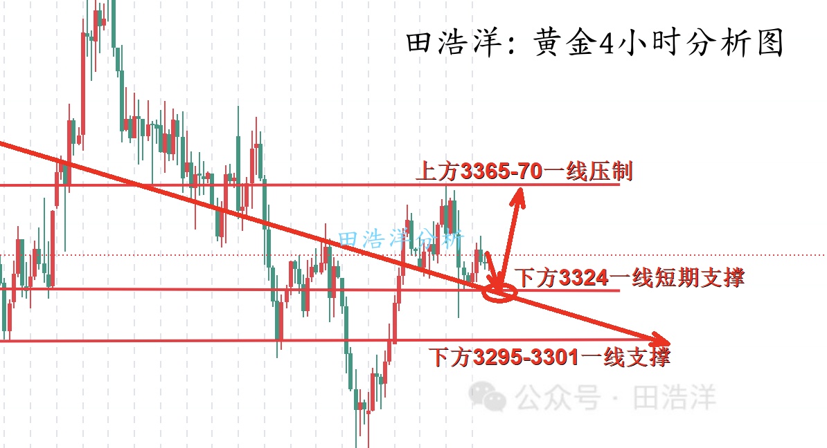 今日黄金受美独立日节假日的影响之下,交易相对而言比较冷淡,下方我们继续关注3324一线的短期质层,上方的重点压力则维持于昨日的开跌口3345-50一线,午夜黄金反抽于3345-50附近可以短空一下,目标看3330-33附近,午夜提前收盘,维持于区间性的震荡!如果你目前黄金操作不理想,希望田浩洋能让你的投资少走弯路,欢迎前来沟通交流! 从4小时分析来看,下方关注3324-30一线支撑,重点关注3316一线支撑位置,上方短线阻力关注3345-50附近,午夜整体维持高空低多循环参与主基调不变,中间位置一律多看少动谨慎追单,耐心等待关键点位参与。具体操作策略我会在盘中提示,及时关注。 黄金操作策略: