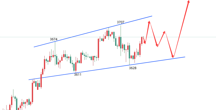 目前在冲高关注3700-10区间压制,这个位置可能会来来回回几次的博弈,博弈中的回踩是我们干多的机会,下面关注3665和3672两个位置的支撑,强支撑是3672的日线的5日线支撑位置,也是之前的形态顶的压制位置转换成了形态支撑位置,如果白盘可以站上3710也可以考虑直接追多。周末文章给了上周收盘在3685一线说明还会继续冲刺3700关口,如果多头延续,那么站稳3700上方也是顺理成章,目前已经全部实现,如果大家关注我本人田浩洋文章或者公钟号,那么你就会提前了解行情的走向以及趋势方向,做多依旧是目前的趋势。如果你目前操作不理想,希望田浩洋能让你的投资少走弯路,欢迎前来沟通交流! 从4小时分析来