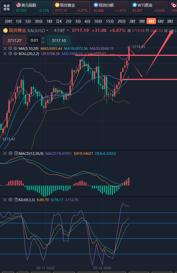 交易本无高手,只是失败的多了,总结的多了,就成长了、成熟了而已,每一个高手都是从学徒开始的,华丽的跌倒,总是胜过无谓的徘徊,不要因恐惧而丧失自信,不要因懦弱而耽误前程。优柔寡断是弱者的天性,而强者眼里没有失败,坎坷都是通往成功路上的一个小景点,你若前进,世界都会为你让路。 ————————消息面 周一(9月22日)现货黄金欧盘时段快速上涨突破历史新高,最高涨至3719.98,金价延续了上周五涨1.12%的上涨势头,目前交投于3717。展望本周,市场将迎来一系列关键数据,包括周二的美日欧9月PMI、周四的美国二季度GDP终值和耐用品订单、周五的美国PCE通胀报告,以及多位联储官员讲话,尤其是美
