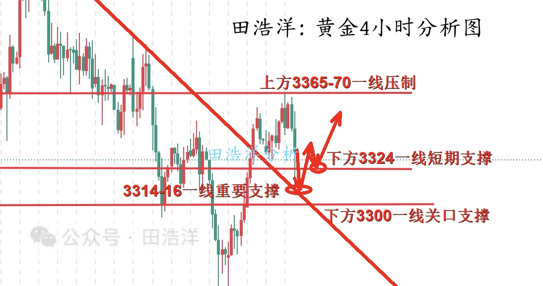 非农基本上已经落下帷幕了,数据全部利空,黄金应声下跌,直接从3350附近下跌至最低3311一线然后反弹,我们稳健观望了一会之后,行情开启了反弹,我们也是直接在3324一线做了多单,多单也是获利出局了,现在我们继续关注3324一线的短期支撑,从技术面来看,非农全面利空没有突破3300关口,那么多头的趋势依旧没有反转,所以我们大胆3324下方可以介入多单,回踩3316一线补仓多,咱们不做死空,也不一股脑做多,要对行情进行灵活变通,如果你目前黄金操作不理想,希望田浩洋能让你的投资少走弯路,欢迎前来沟通交流! 从4小时分析来看,下方关注3324一线短期支撑,重点关注3314-18一线支撑位,短线回撤