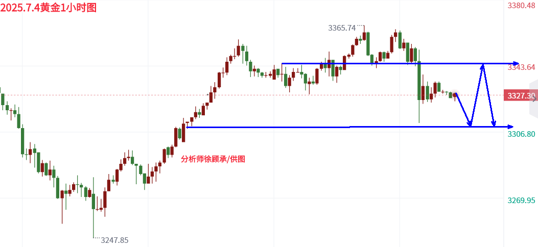 因部分数据表现良好,市场对7月降息的预期迅速降温,就连9月降息的概率也随之降低,降息时间节点大概率将进一步后延。周三公布的ADP数据却远低于市场预期,这犹如一颗“兴奋剂”,刺激黄金向上拓展空间,且此前黄金已连续三日上涨,市场看涨情绪瞬间被点燃,多头氛围浓厚。六月非农数据却给这炽热的多头行情泼了一盆“冷水”。非农就业人数实际值达14.7万人,不仅远超市场预期,还超过了前值,同时失业率降至4.1%。如此强劲的数据组合,完全出乎市场意料,成为扭转黄金行情的关键力量。受此影响,黄金遭遇非农大利空,价格大幅下挫并跌破关键位置。 黄金短线来看,黄金高位承压明显,多头遭受重创且短期内难以修复,操作上应以反