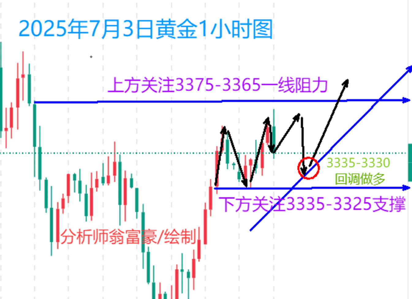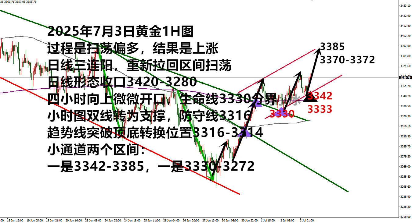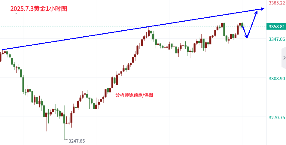 张津镭:ADP爆冷后黄金蓄势待发!今晚非农或引爆行情 昨日黄金继续走了一个偏多行情,亚盘开盘基本就是围绕3320附近震荡,欧盘进场3330附近多单,随后金价逐步反弹,晚间最高是到了3350一线,多单赚取20美金手动离场。最终金价是收盘于3357美元,日线收于3连阳。 周四(7月3日)昨夜美国6月ADP就业数据意外减少3.3万人(为2023年初以来首次下降),强化了市场对9月降息的押注,推动金价连续三日上涨。今晚8点半公布的6月非农就业报告是核心焦点。若数据低于预期(如失业率升至4.3%或非农新增就业低于15万),可能进一步刺激金价突破3400美元;反之若数据强劲(如高于20万),或引发技术性