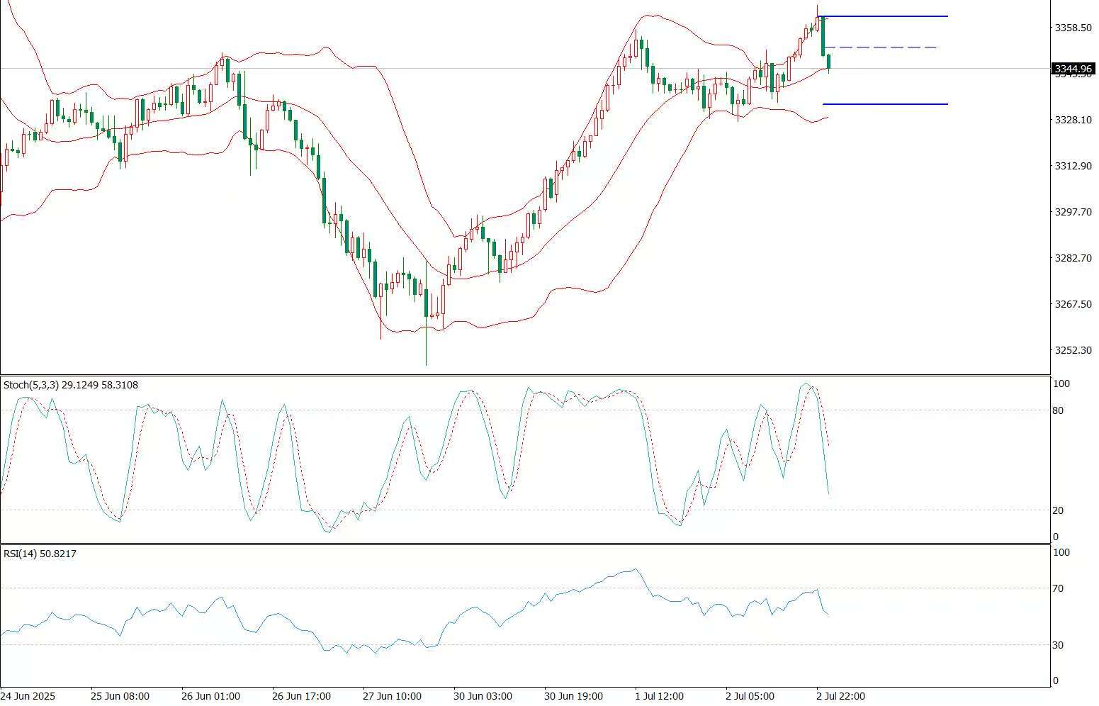 美国ADP就业数据意外爆冷,成为搅动黄金市场的关键因素。6月私营部门就业人数大幅减少3.3万,与市场预期的增加9.5万相差甚远,且前值还被向下修正,创下2023年3月以来的最大单月跌幅。ADP数据公布后,市场反应迅速,美元指数短线急跌,而黄金作为传统避险资产,凭借其独特的避险属性,吸引资金流入,价格迅速走高。市场目光聚焦于周四(因独立日假期提前发布)的非农就业报告,投资者对于劳动力市场的韧性以及美联储后续政策路径的预期分歧进一步扩大。 黄金昨日走势多空双方激烈博弈。早盘黄金反弹至3344美元受阻,回落至3328美元企稳后再次试探该阻力位未果。欧盘时段,黄金在3327美元企稳后反弹至3347美