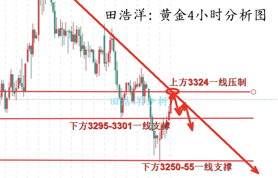 黄金开盘从3302一线然后调整后一路上扬,目前多头冲击3320一线有继续冲刺的势头,但是我们关注3324一线这里多空重要分水岭位置,如果成功站稳上方,那么说明行情已经反转了,那么回踩我们再找机会多,否则如果不能突破,那么我们可以找进场位置布局空单,空单目标可以看3295-3301一线位置,这里也是昨天短期的压制位,我们昨天做空也是成功获利的地方,我们目前就是关注上方3324一线是否能守住来进行后面操作。如果你目前黄金操作不理想,希望田浩洋能让你的投资少走弯路,欢迎前来沟通交流! 从4小时分析来看,上方重点关注3324一线多空分水岭压制,下方短线支撑关注昨日短期压制3295-3301一线附近,
