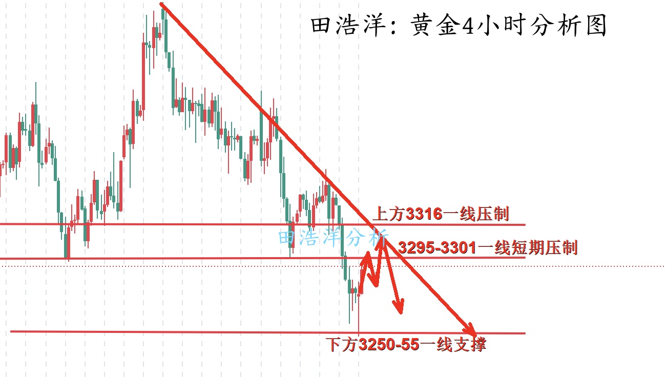 黄金早盘在冲高3282附近承压快速回踩3247附近低点支撑之后走出一波强势反抽目前最高反抽3296一线,我们在3263一线做多,也是成功到了目标位置,3295-3301一线附近也是周末和今天给大家分享可以空的位置,我们实盘和文章也及时给了3295一线做空,目前最低触及3274一线,有参与的朋友也是成功兑现了一波回调的利润空间,晚间继续关注上方3295-3301一线短期压制,关注3316一线压制,反弹不破可以空。如果你目前黄金操作不理想,希望田浩洋能让你的投资少走弯路,欢迎前来沟通交流! 从4小时分析来看,上方短期阻力关注3297-3301一线附近,关注3315-3316一线压制,重点关注33