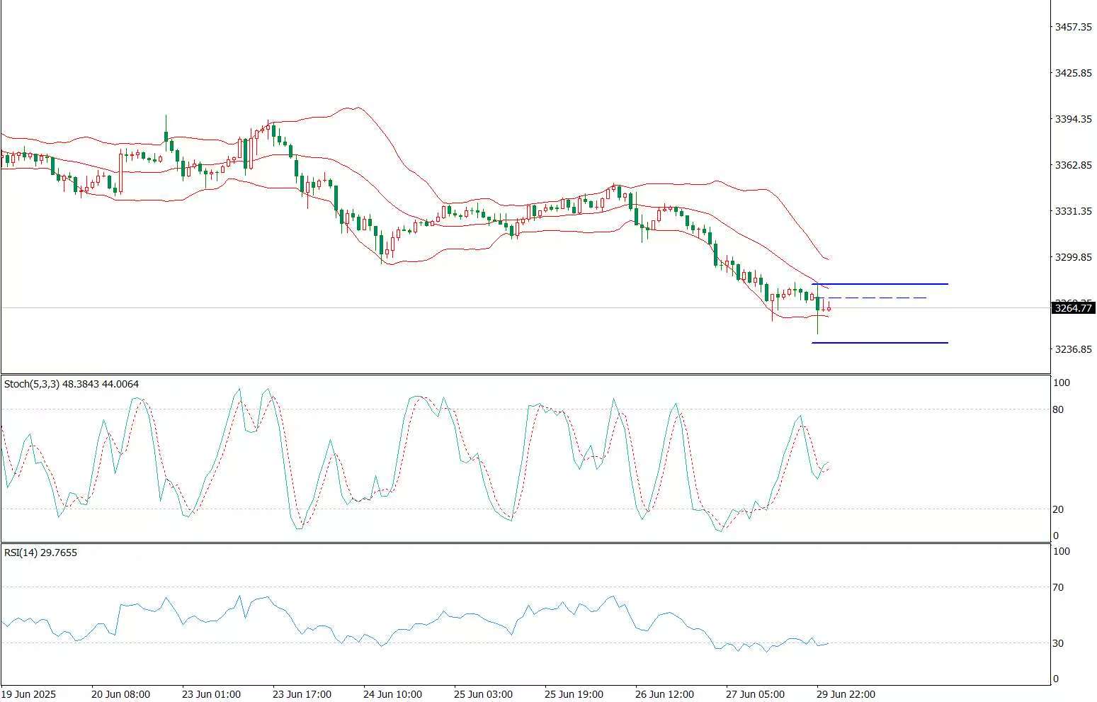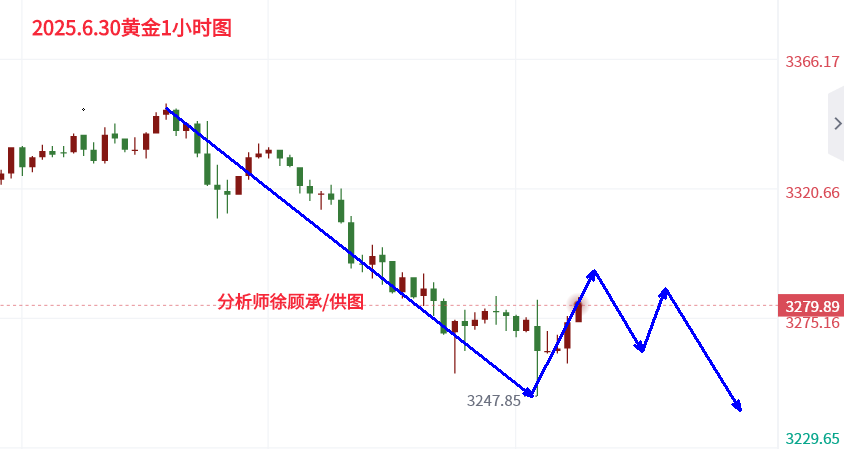 2025年6月29日星期日 黄金连续循环阴跌,大空头是否来临? 本周黄金走了空头延续,再次跌破3300整数关口! 月线首先在即,注意观察,空仓的可暂时先行观望观察月线收官情况,再做打算不迟。 周五止步3260附近关键位置,能否继续延续跌势,该位置尤其关键。也成当前格局南下日间第一关键阻力,一旦再次跌破下方位置在哪暂时不必计较,如有效支撑,上方关键压力仍首看3300整数关口至3310区间位置区域。 4小时结合日k连续循环下行,注意周期趋势把握,和趋势中的横盘震荡整理形态转换的风险和机会把控! 1小时3300-3310区域仍是上方关键压力区域,一旦测试,注意观察。 综合:行情循环下行,注意强支撑
