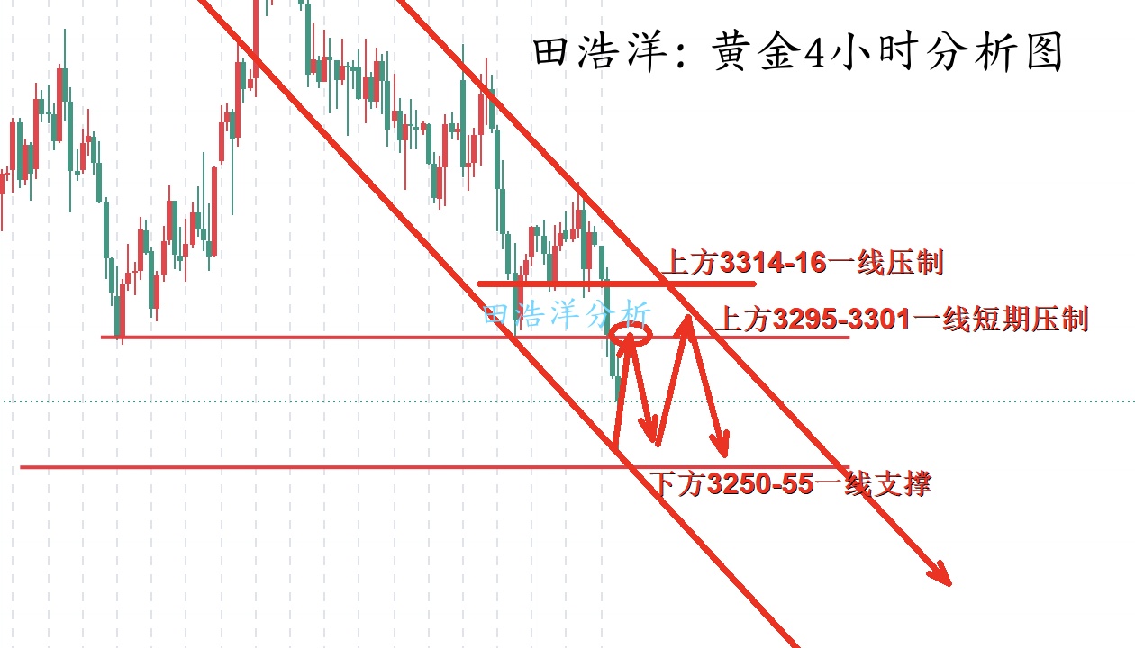 黄金周五午夜终究是没有突破上方压制,收盘在3274一线,午夜我们也给了思路分析,黄金午夜震荡至停盘,所有的结果如期进行,下周我们继续关注上方短期压制3295-3301一线,重点关注3314-16一线压制,由于收盘没有突破上方3300压制关口,那么下周我们继续以反弹做空的趋势进行,毕竟技术面依旧是空头,顺势操作才能跟上吃肉的节奏。周末我们也关注国际消息面,结合消息面我会在周一开盘前进行具体策略思路分析。如果你目前黄金操作不理想,希望田浩洋能让你的投资少走弯路,欢迎前来沟通交流! 从4小时分析来看,上方短期阻力关注3295-3301一线附近,重点关注3314-16一线重要压制,操作上依旧反抽继续