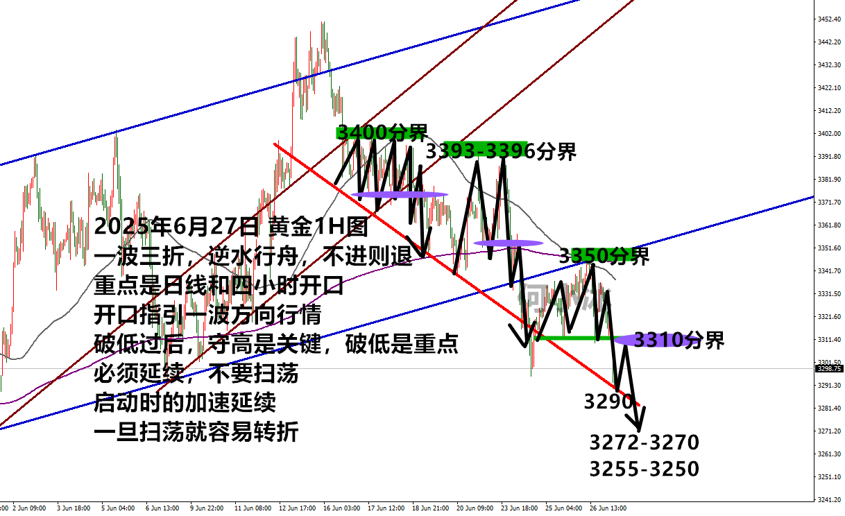 金老虎:川普宣布停衅,伊以无视告诫,黄金中线看3247; 看不懂一段行情,在怎么去琢磨,也是疲倦,看懂一段行情,顺势而为,在怎么做也是愉悦,低谷望天总是迷茫,高山看低谷总是恐惧,细雨纷纷,阴雨沉沉,好似行情看不到阳光,一直弱势下跌,在市场中你所谓的以为只是你以为,真正的贪婪全凭川普一句话;时间长了,我认为川普上台,就一直走这么一个流程,制造矛盾-切入利润-平仓出局-调和矛盾-平息矛盾; 黄金行情分析 似懂非懂的行情经历一轮跳水然后拉个上升趋势形态,你就觉得会反弹了,那有那么容易,好的事情总是需要经历一些变化和磨练才能如你所愿,昨天完美的N形态走势,今天早间延续昨天的弱势,也是破位了昨天的低点