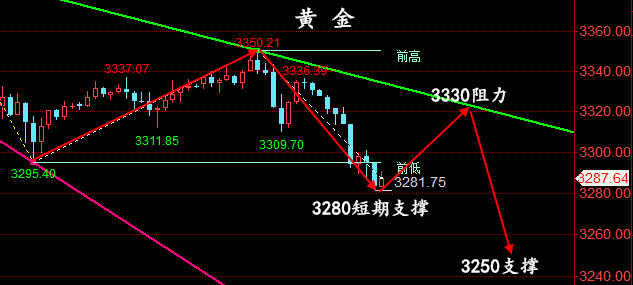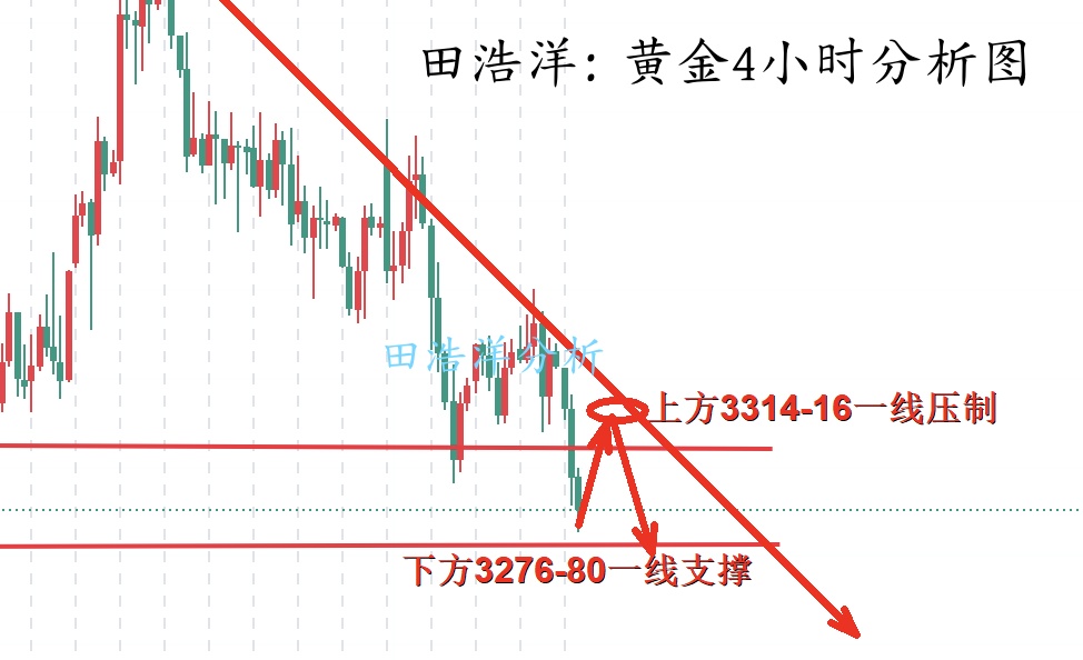 黄金今天跌破本周低点3295一线,截止目前黄金触及3281一线震荡,大家千万不要追空,反弹再做空,现在的只有耐心等待反弹再介入空单进场,做一个稳健的猎人,耐心等待猎物的出现! 黄金现在关注上方3301-3306一线短期压制,重点关注上方3314-16一线压制,下方支撑关注3276-80一线,反弹承压再做空,具体等待我实时给出! 策略思路: 1、黄金反弹3301-3306一线轻仓空一下,反弹3314-16一线补仓空,止损3324,目标3280-85一线; 文/田浩洋——专业国际市场点评,针对实际市场参与者,考虑到部分市场窗口对于实盘交易具有一定的时效性可关注笔者,从而能够选择合适的策略进行操作