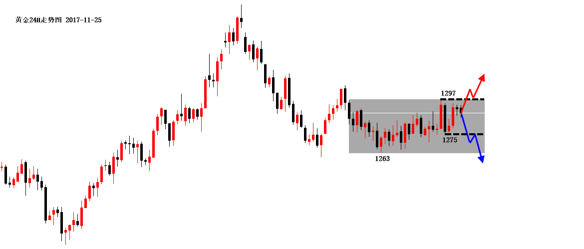 因黄金在感恩节到来之前两日一度大幅走高,跟上维姗这边操作的投资朋友提前获利了结。由于上周后两个交易日恰逢感恩节假期,全球欧美市场交投清淡,而美盘更是连续两日提前休市,使得黄金走势波幅较小,以5美金的波幅演绎,而整个交易周自周初的避险情绪消退大幅下跌至1274的周初低点后,黄金价格在后几个交易日温和反弹,将