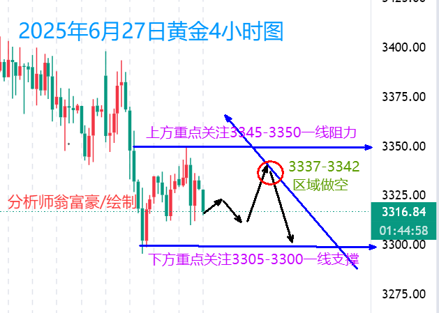 高晓峰:6.27黄金冲高回落显疲态,日内策略逢高做空! 昨日黄金冲高3350一线后回落3309低点,显示金价短期显露疲态。主要受中东局势缓和及美联储降息预期推迟的双重因素压制,黄金上行受限。昨夜反弹在3337受阻,早盘此位可视为二次放空点,反抽到位仍可博弈空单。下行首看3300支撑,若破位则下探3290低点。小时线技术形态整体偏空,但需警惕周五市场可能的变数。日内操作建议偏空. 黄金建议:反弹3332-3337区间做空 止损3344 目标3300 文/高晓峰(jcx68008)专业国际市场点评 ,本人解读世界经济要闻,剖析全球投资大趋势,对原油、黄金、白银等大宗商品等有深入的研究,以上内容