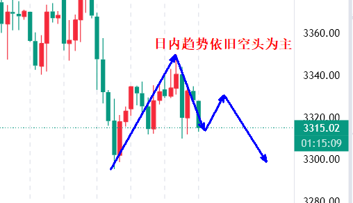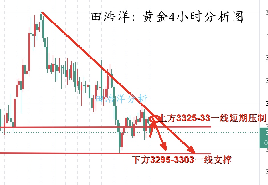黄金早盘开盘在3328一线回踩,最低触及3313一线反弹震荡,空头持续发力,从黄金4小时均线来看已经进入空头形态,那么黄金下方的空间可能将进一步打开,而且黄金4小时整体就是下行趋势,黄金4小时在3340上方都是上影线,也就是黄金4小时的实体没有真正站稳过3340,也是证明上方压制比较大,黄金3340上方就是属于诱多行情,那么黄金依旧保持震荡下跌的走势,昨天我们白天3342-48全部都布局了空单,昨晚后半夜黄金反弹高点3336一线承压收盘在3328一线,操作上反弹继续做空为主!如果你目前黄金操作不理想,希望田浩洋能让你的投资少走弯路,欢迎前来沟通交流! 从4小时分析来看,上方短期阻力关注332