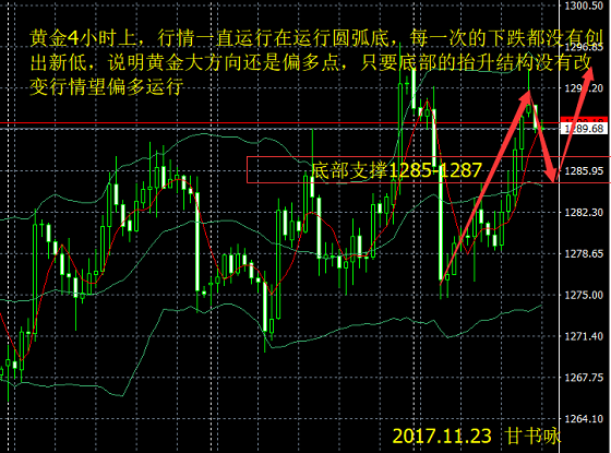 天安点金:11.22原油黄金天然气日内操作计划! 人生如戏戏如人生,蓦然回首岁月流走,还有多少东西值得回忆,还有什么值得思考。经过时间的沉淀,生命里唯一忘不掉的是与你的情谊,据说感恩节既是表达谢意的日子,又是充满祝福的日子,祝大家:幸福一生,友谊长存! 黄金行情分析: 趋势:看涨 日线图10、30日均线处于1282附