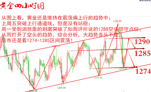 谷梁铭:黄金走弱回吐上涨空间 伦敦金下跌还看1270支撑 隔夜黄金大跌,回顾昨日行情,亚盘时段,金价依托1295的阻力位小幅走跌至1290关口,欧盘小区间震荡过渡,美盘时段,金价自1290关口小幅反抽至1293.5一线受阻,随后空头发力,金价跌破1290关口,1280支撑位,最低下探至1274.3一线,最终收盘报价1276.5美元/盎司,日线上