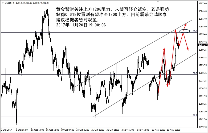 11-20晚间黄金原油走势分析,静待破位看中线 市场消息 黄金上周五(11月17日)大涨,并录得带上影线的大阳线,金价当天最高触及1297美元,最低下探至1277.60美元。上周五金价突破此前1260-1291美元的窄幅区间,且尝试上探1300美元的整数关口,想必是有人欢喜有人愁。 本周要密切关注周二欧央行长德拉基与周三美联储主席耶
