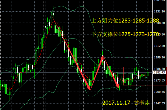 甘书咏:11.17金价区间收缩将迎爆发行情 日内黄金原油操作解析 隔日(11月16日)金价小幅下跌,维持区间波动,因美国众议院通过了其税改立法议案,美国财政政策走向可能使此前预期中的加息对市场的影响发生变化,现货黄金小涨0.05%,报1278.75,盘中金价一度触及三周半高位1289.09美元。原油隔日油价再次下跌,因对美国产量和