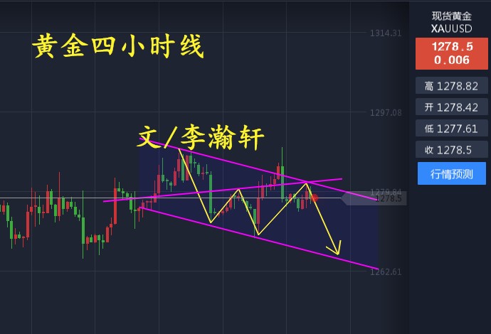 黄金昨日走了一波下跌后,行情逐步走高,从低点1274到现在最高1281附近,小时级别以小阳线走高,但上方1284一线对黄金依旧有较强的压力,在没有突破前,黄金反弹依然无效,很有可能随着美元的不断抬升而走低,目前来看黄金布林带开始持平,短线上黄金偏弱势,不过从4小时图上看,我们把近期的行情整体去分析,金价维持着震荡